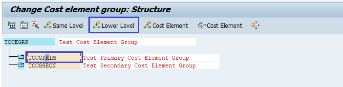 Step-5: - Now we will add Primary Cost Element Group at lower level to the TCCEGRP. Click on Lower Level button to add it at lower level.